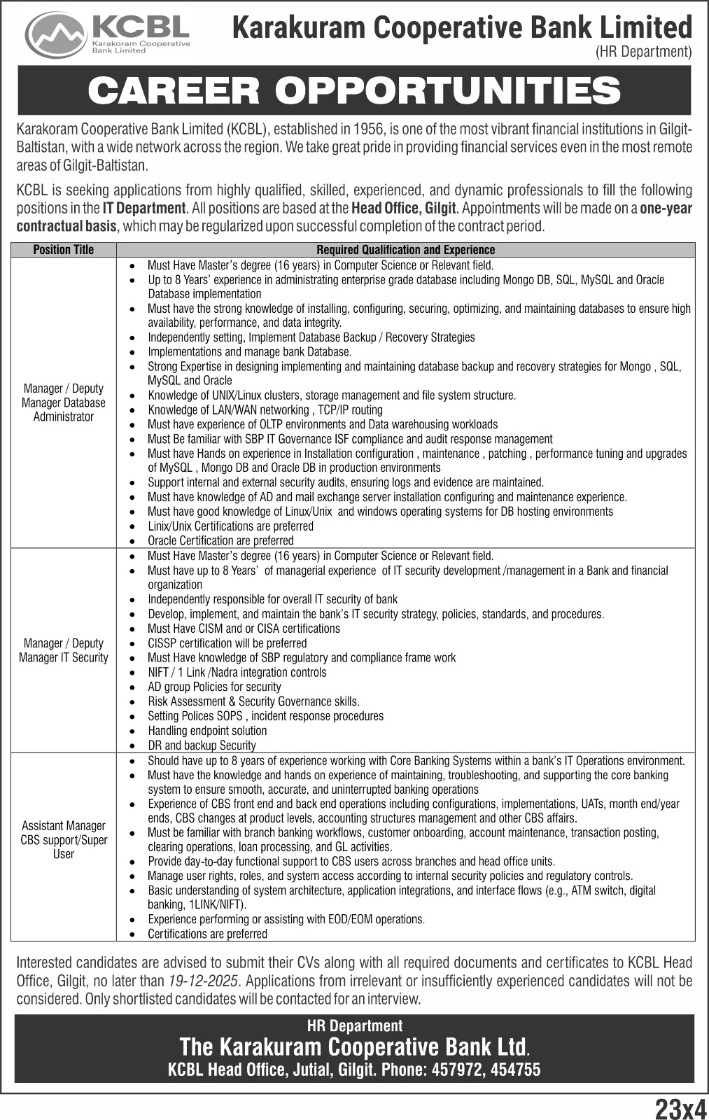 KCBL is seeking applications from highly qualified, skilled, experienced, and dynamic professionals to fill the following positions based in Head Office Gilgit.